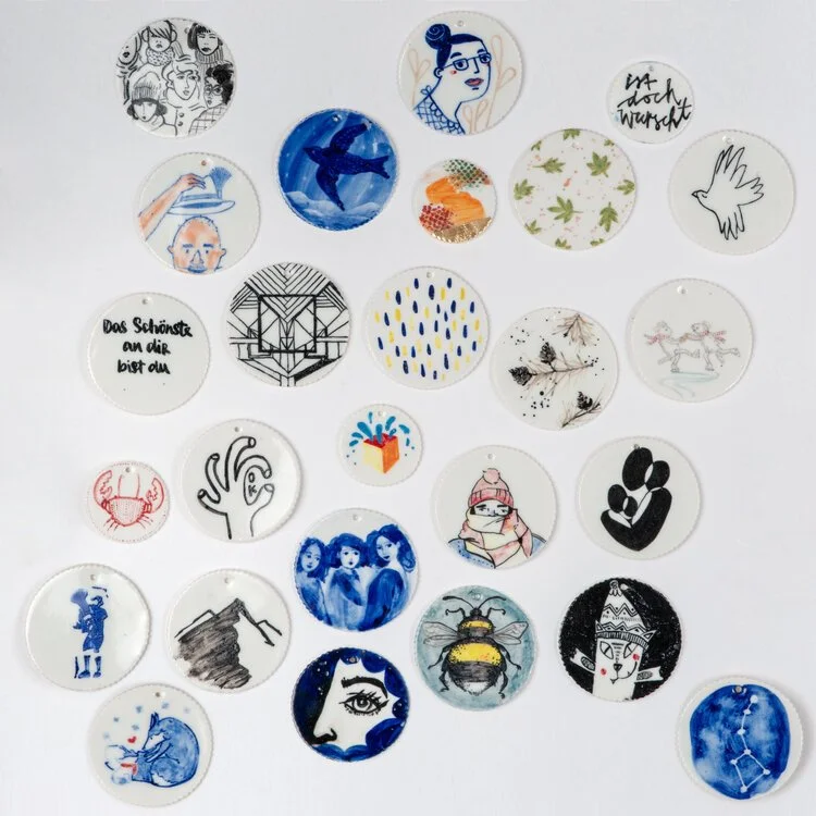 A combination of the creative contribution of 25 illustrators, designers and artists from, and, around Munich, High Five to Creative Loyalty made it possible to share different ideas and knowledge between creatives of other areas and languages. Through the process, each of the creatives created 20 pieces of porcelain pendants with their own styles and themes. The result was a total of 500 tiny works of art.
