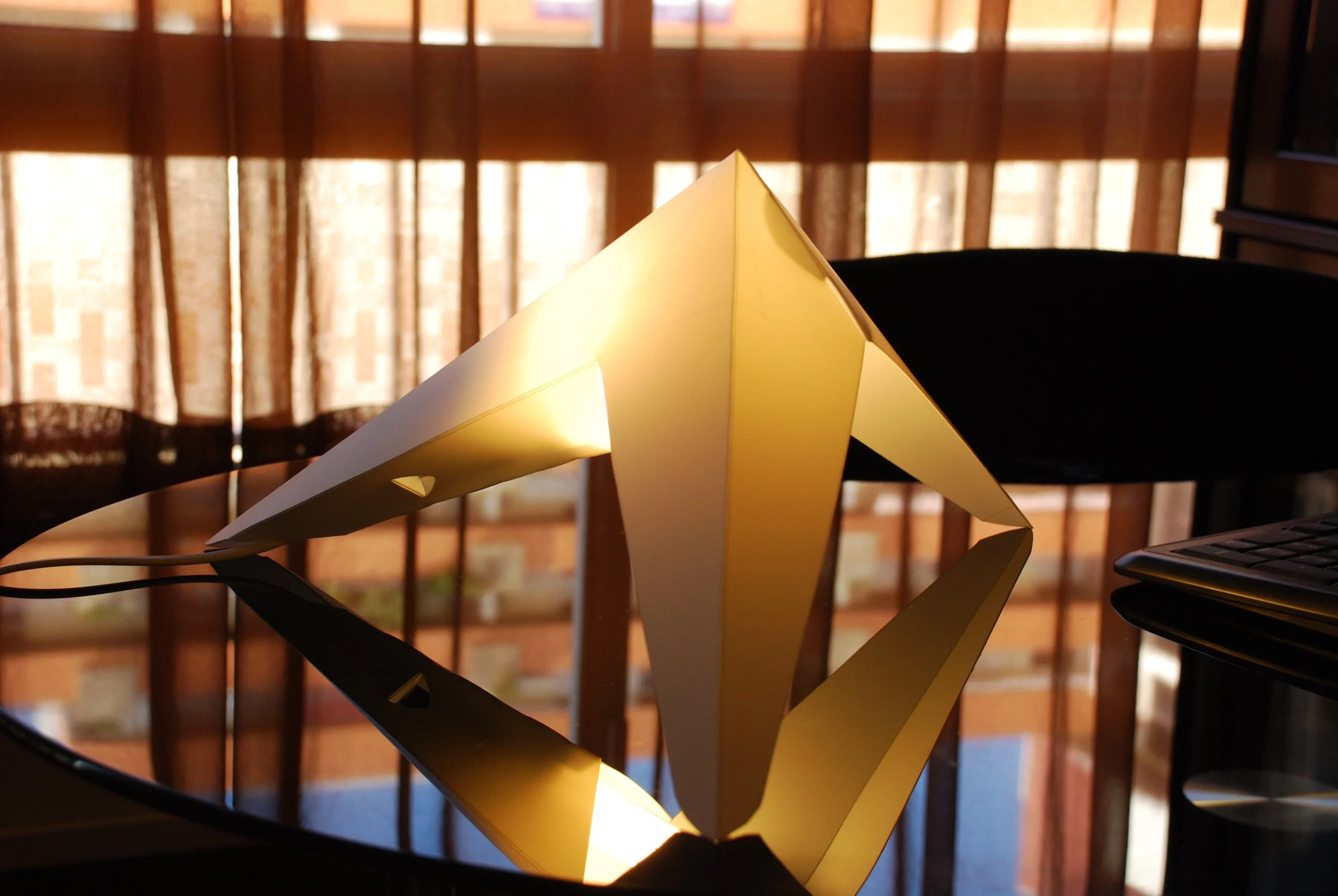 I combined the assembly concept with a pop-up design to create a lamp available in two typologies: floor and table. This lamp projects ambient light and features a tripod structure shaped like an irregular star, made up of three sets of grooves. The wire exits discreetly from the leg of the light bulb. The wire exits discreetly by the light bulb’s leg.